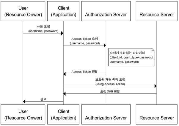 | Resource Owner Password Credentials Grant Type | 리소스 소유자 암호자격 증명타입. Resource Owner가 직접 Client에 아이디/패스워드 입력하여 Authorization 서버에 인증받고 access token을 얻는 획득하는 방식. |